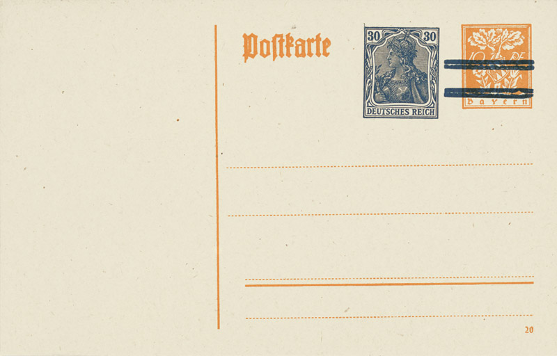 Ausserkraftsetzung der Postkarten mit bayerischen Wertstempeln zum 31.05.1920 (Aufbrauch bis zum 30.06.1920). Die postseitigen großen Restbestände wurden 1921 mit dem genannten Wertstempelzudruck versehen (Porto bis 31.12.1921 für den Ortsverkehr, bis 31.03.1921 für den Fernverkehr)